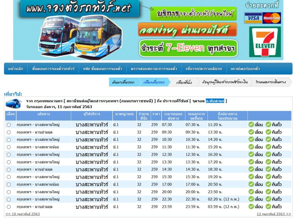 - 07:30 : กรุงเทพฯ – บางสะพานใหญ่ …ป.1… ราคาตั๋วประมาณ 259 บาท